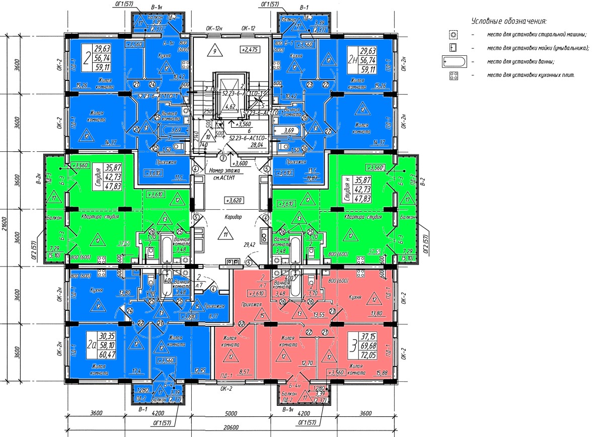 двухкомнатные – 30 шт., общей площадью от 58,88 кв. м. — до 60,47 кв. м.